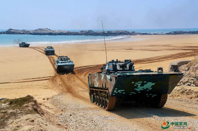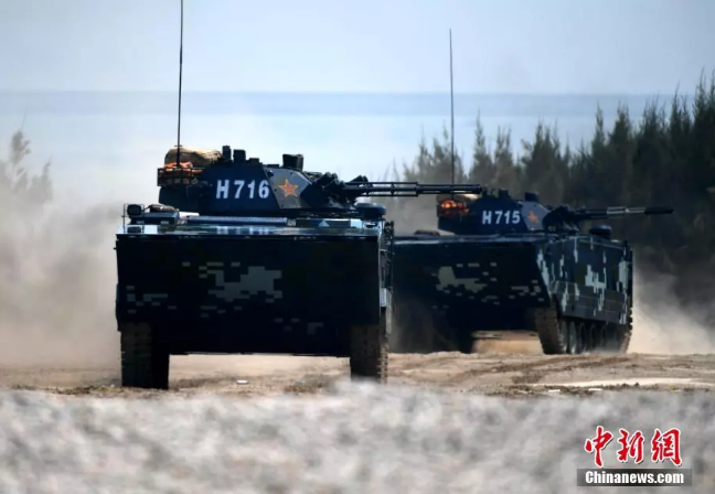 作戰課目演示中,兩棲裝甲車從海上發起沖擊,泛水抵灘后迅速鎖定目標,大口徑突擊炮、車載機槍連番開火,遠方的靶標紛紛應聲而落。