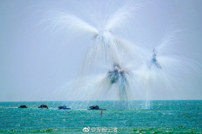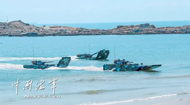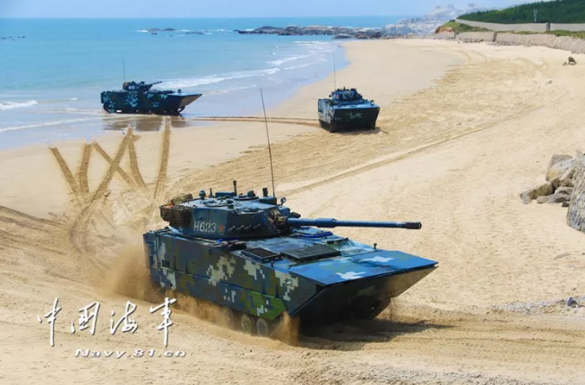 作戰課目演示中,兩棲裝甲車從海上發起沖擊,泛水抵灘后迅速鎖定目標,大口徑突擊炮、車載機槍連番開火,遠方的靶標紛紛應聲而落。